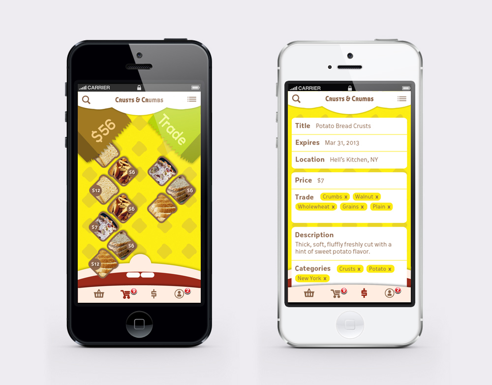 The shopping cart can be viewed by tapping the first icon on the lower tab bar. It will show items you want to buy and trade in separated categories. For the sell/trade page, which is accessible through the third icon on the same tab bar, there will be a form to fill and upload photos.