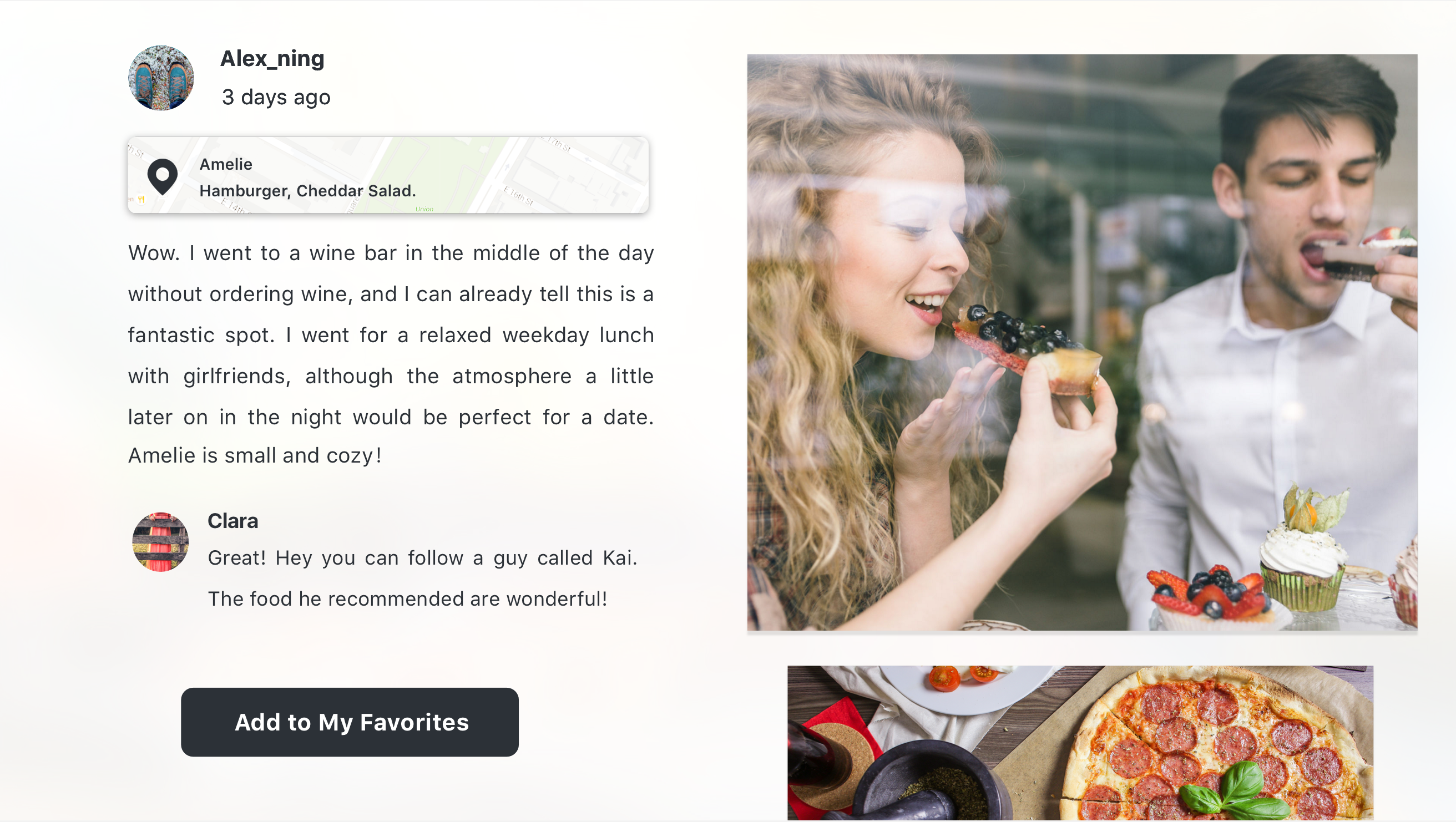 - One user mentioned that she preferred to add to her favorites at the restaurant view instead of the story view. And she had a very good reason that she paid more attention on the restaurant than the story. This conversation reveals another type of the users who focus more on the the restaurant. Although the platform is about stories, it is also very important to provide tools for people to add the restaurant into their folders, which actually fit the scenarios.